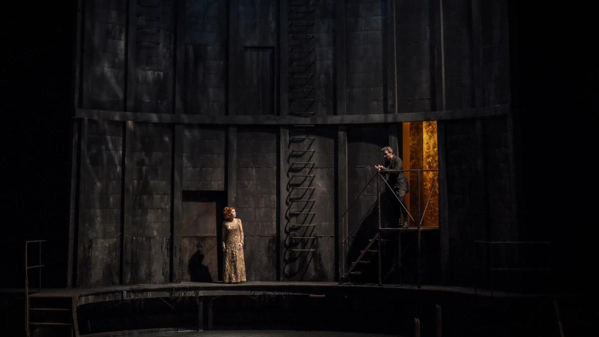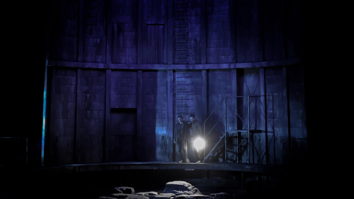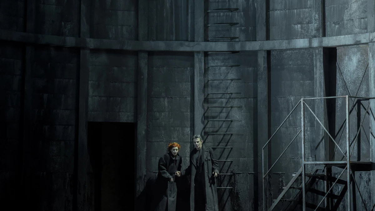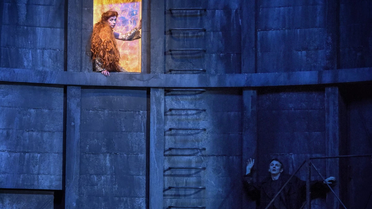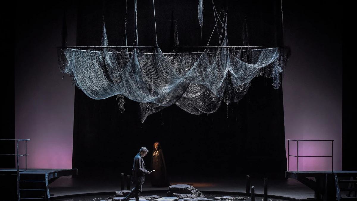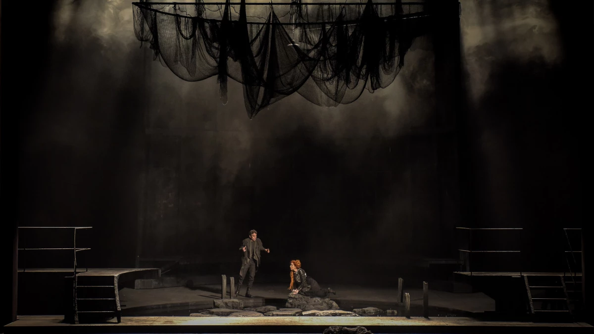 Pour sa scénographie, Eric Ruf s’est inspiré de la base de sous-marin de Lorient : un lieu abandonné, hors du temps, où la lumière ne pénètre point et où les stalactites finissent par se former tant l’humidité y est présente. Le vieux château d’Allemonde est ainsi suggéré par un dispositif sombre et humide, comme l’intérieur d’un silo ou d’un réacteur de centrale en demi-cercle sur fond d’eau stagnante. Cette eau, omniprésente sur scène, représente toutes les sources évoquées dans le livret – tantôt fontaine, tantôt grotte, tantôt l’océan… Au cintre, une forêt de filets modifie le paysage au gré des scènes. Poétiquement mis en lumière par Bertrand Couderc, le décor semble sans cesse mouvant, trouble.